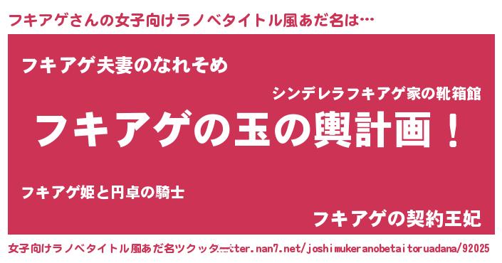 | 男性向けラノベタイトル風あだ名 | 『フキアゲ~年齢イコール彼女いない歴の魔法使い~』 |