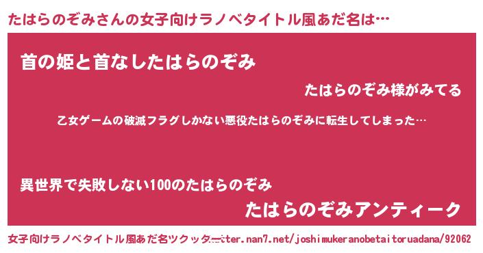 | 男性向けラノベタイトル風あだ名 | 『この素晴らしい世界にたはらのぞみを!』 |
