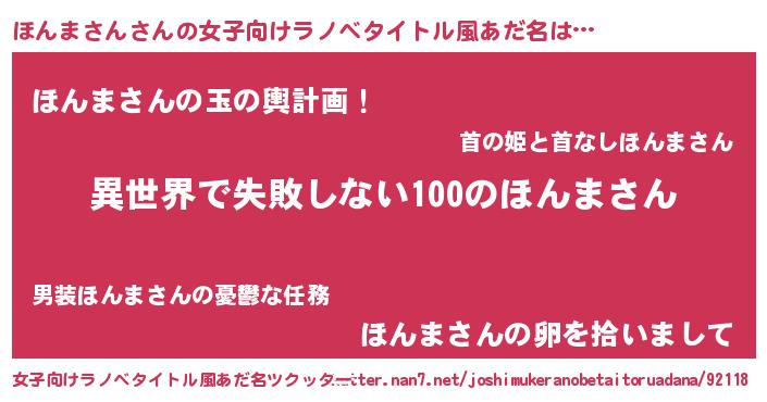 ほんまさんさんの女子向けラノベタイトル風あだ名は… 『異世界で失敗しない100のほんまさん』『ほんまさんの玉の輿計画!』『ほんまさんの卵を拾いまして』 ツクッター #女子向けラノベタイトル風あだ名ツクッター http://tkutter.nan7.net/joshimukeranobetaitoruadana/92118/