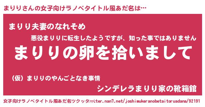| 男性向けラノベタイトル風あだ名 | 『ダンジョンにまりりを求めるのは間違っているだろうか』 |