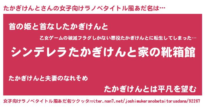 たかぎけんとさんの女子向けラノベタイトル風あだ名は… 『シンデレラたかぎけんと家の靴箱館』『首の姫と首なしたかぎけんと』『たかぎけんとは平凡を望む』 ツクッター #女子向けラノベタイトル風あだ名ツクッター http://tkutter.nan7.net/joshimukeranobetaitoruadana/92267/