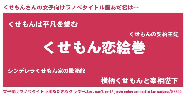 | 男性向けラノベタイトル風あだ名 | 『おまえをオタクにしてやるから、俺をくせもんにしてくれ! 』 |