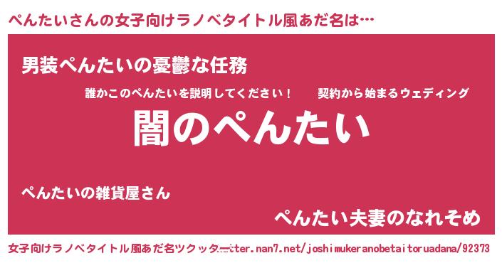 | 男性向けラノベタイトル風あだ名 | 『Re:ぺんたいから始める異世界生活』 |