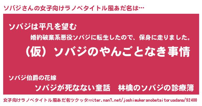 ソバジさんの女子向けラノベタイトル風あだ名は… 『(仮)ソバジのやんごとなき事情』『ソバジは平凡を望む』『ソバジが死なない童話 林檎のソバジの診療簿』 ツクッター #女子向けラノベタイトル風あだ名ツクッター http://tkutter.nan7.net/joshimukeranobetaitoruadana/92400/