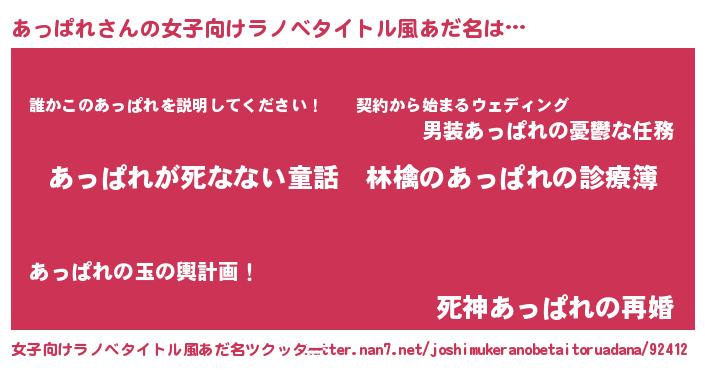 | 男性向けラノベタイトル風あだ名 | 『魔弾の王とあっぱれ』 |
