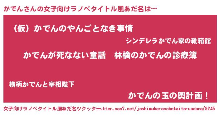 | 男性向けラノベタイトル風あだ名 | 『魔弾の王とかでん』『かでんの憂鬱』 |