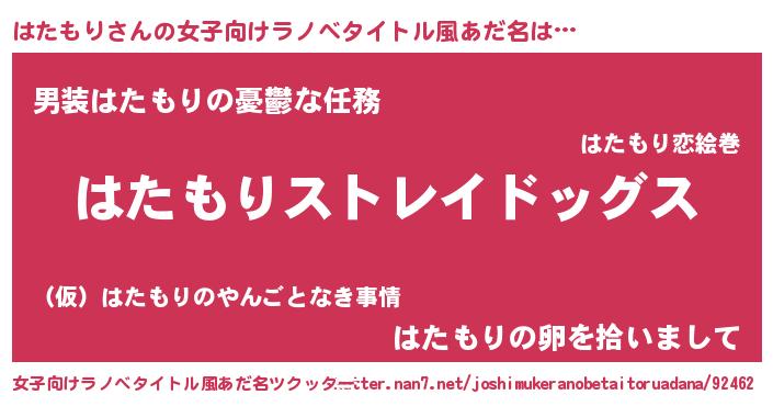 | 男性向けラノベタイトル風あだ名 | 『Re:はたもりから始める異世界生活』 |