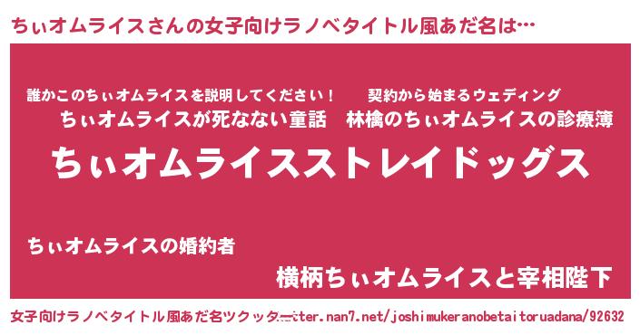 | 男性向けラノベタイトル風あだ名 | 『Re:ちぃオムライスから始める異世界生活』 |