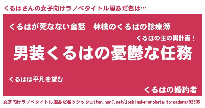 | 男性向けラノベタイトル風あだ名 | 『うちのくるはが世界を掌握している!』 |