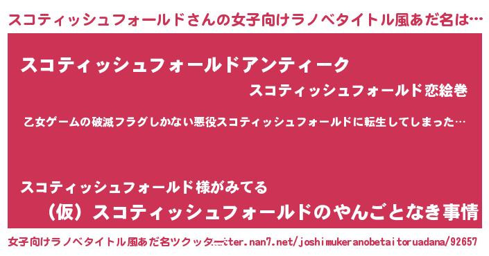 | 男性向けラノベタイトル風あだ名 | 『魔弾の王とスコティッシュフォールド』 |