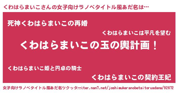 | 男性向けラノベタイトル風あだ名 | 『くわはらまいこ~年齢イコール彼女いない歴の魔法使い~』 |