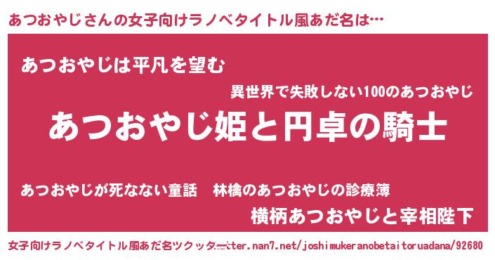 | 男性向けラノベタイトル風あだ名 | 『アツオヤジアートオンライン』 |
