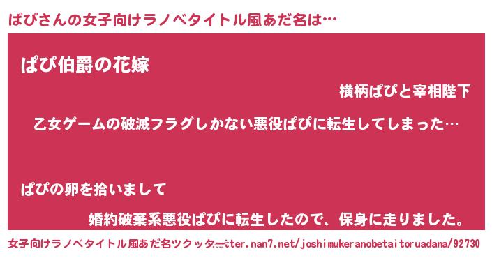 | 男性向けラノベタイトル風あだ名 | 『この素晴らしい世界にぱぴを!』 |