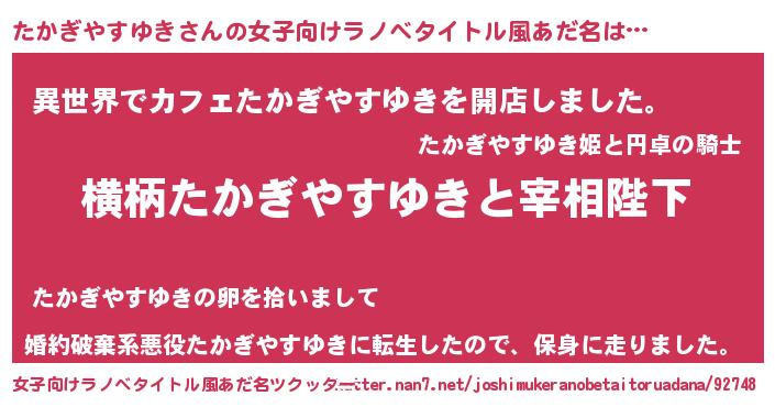 | 男性向けラノベタイトル風あだ名 | 『たかぎやすゆきに滅ぼされるだけの簡単なお仕事です』 |