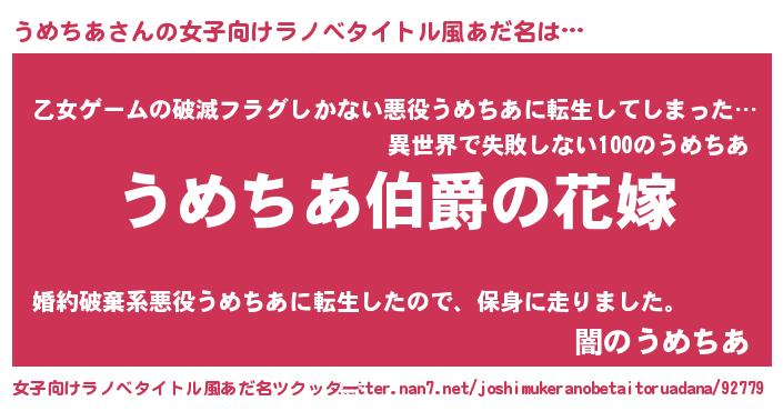 | 男性向けラノベタイトル風あだ名 | 『うちの娘の為ならば、俺はもしかしたらうめちあも倒せるかもしれない。』 |