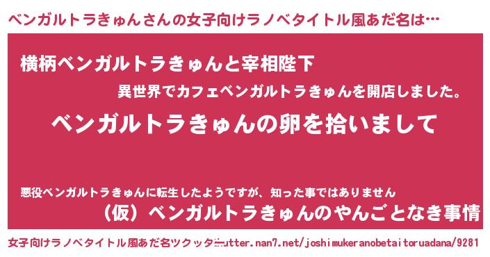 | 男性向けラノベタイトル風あだ名 | 『ベンガルトラきゅんの嫁は女の子じゃないと思った?』 |
