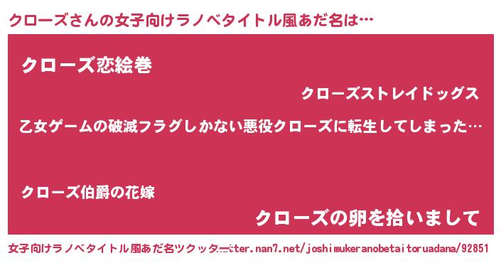 | 男性向けラノベタイトル風あだ名 | 『魔弾の王とクローズ』 |