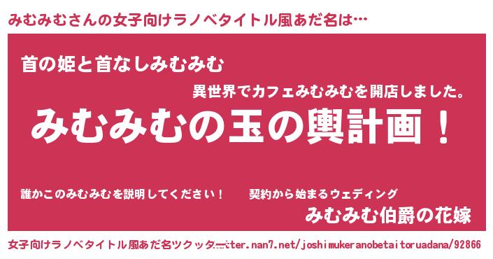 | 男性向けラノベタイトル風あだ名 | 『みむみむ~年齢イコール彼女いない歴の魔法使い~』 |