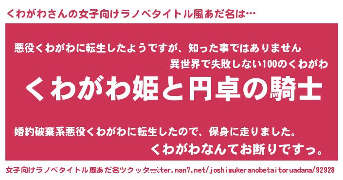 男性向けラノベタイトル風あだ名 | 『くわがわの憂鬱』『クワガワスレイヤー』 |