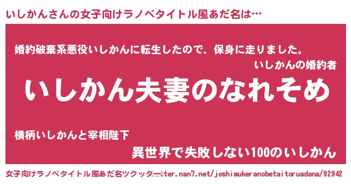 | 男性向けラノベタイトル風あだ名 | 『おまえをオタクにしてやるから、俺をいしかんにしてくれ! 』 |