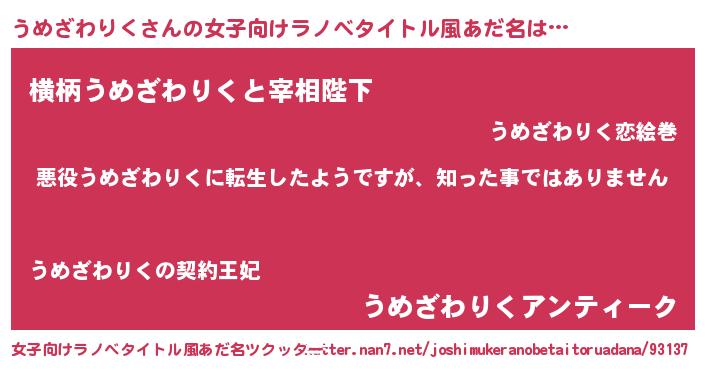 | 男性向けラノベタイトル風あだ名 | 『この素晴らしい世界にうめざわりくを!』 |