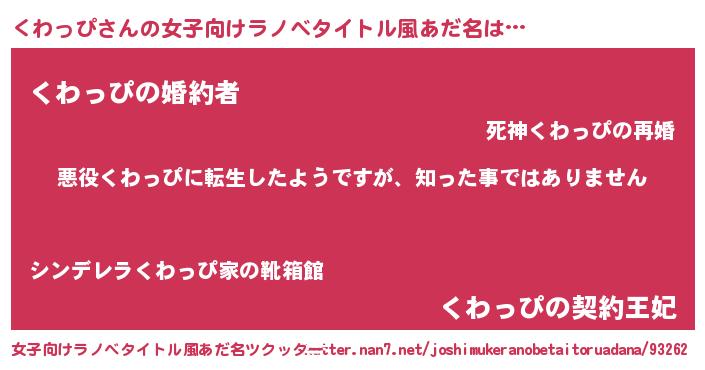 | 男性向けラノベタイトル風あだ名 | 『この素晴らしい世界にくわっぴを!』 |