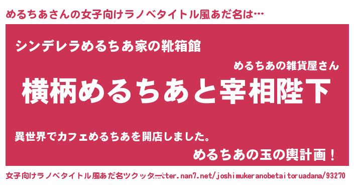 | 男性向けラノベタイトル風あだ名 | 『めるちあに滅ぼされるだけの簡単なお仕事です』 |