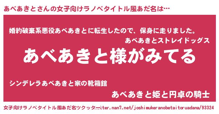 | 男性向けラノベタイトル風あだ名 | 『あべあきとの嫁は女の子じゃないと思った?』 |
