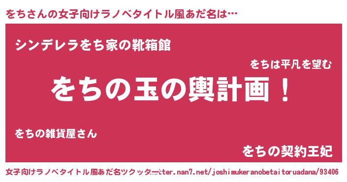 をちさんの女子向けラノベタイトル風あだ名は… 『をちの玉の輿計画!』『シンデレラをち家の靴箱館』『をちの契約王妃』 ツクッター #女子向けラノベタイトル風あだ名ツクッター http://tkutter.nan7.net/joshimukeranobetaitoruadana/93406/