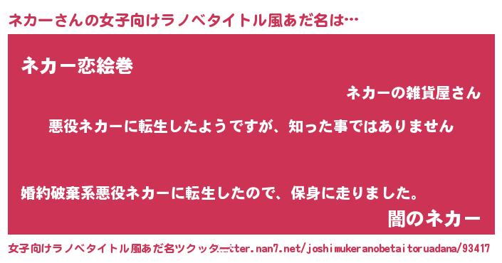 | 男性向けラノベタイトル風あだ名 | 『この素晴らしい世界にネカーを!』 |