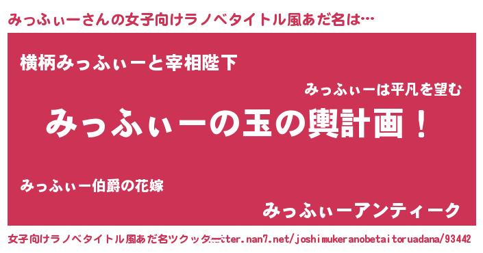 | 男性向けラノベタイトル風あだ名 | 『みっふぃー~年齢イコール彼女いない歴の魔法使い~』 |