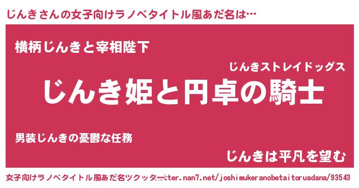 じんきさんの女子向けラノベタイトル風あだ名は… 『じんき姫と円卓の騎士』『横柄じんきと宰相陛下』『じんきは平凡を望む』 ツクッター #女子向けラノベタイトル風あだ名ツクッター http://tkutter.nan7.net/joshimukeranobetaitoruadana/93543/