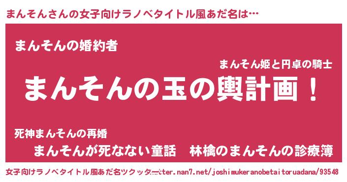 | 男性向けラノベタイトル風あだ名 | 『まんそん~年齢イコール彼女いない歴の魔法使い~』 |