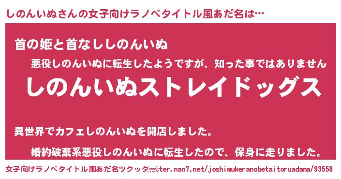 | 男性向けラノベタイトル風あだ名 | 『Re:しのんいぬから始める異世界生活』 |