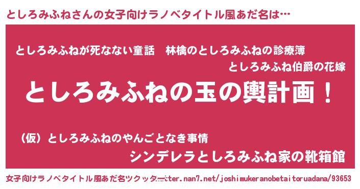 としろみふねさんの女子向けラノベタイトル風あだ名は… 『としろみふねの玉の輿計画!』『としろみふねが死なない童話 林檎のとしろみふねの診療簿』『シンデレラとしろみふね家の靴箱館』 ツクッター #女子向けラノベタイトル風あだ名ツクッター http://tkutter.nan7.net/joshimukeranobetaitoruadana/93653/