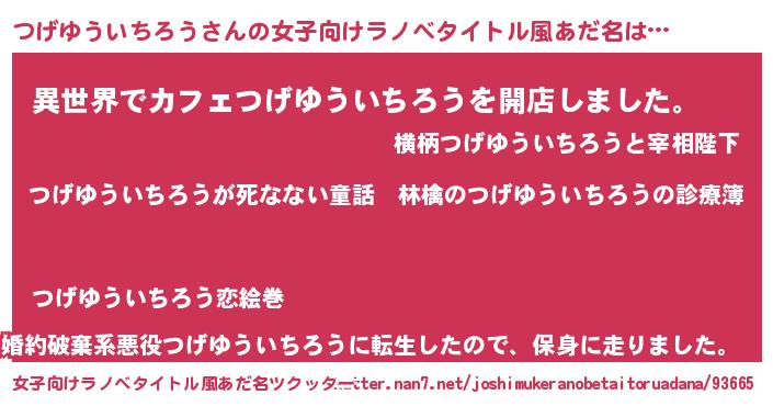 つげゆういちろうさんの女子向けラノベタイトル風あだ名は… 『つげゆういちろうが死なない童話 林檎のつげゆういちろうの診療簿』『異世界でカフェつげゆういちろうを開店しました。』『婚約破棄系悪役つげゆういちろうに転生したので、保身に走りました。』 ツクッター #女子向けラノベタイトル風あだ名ツクッター http://tkutter.nan7.net/joshimukeranobetaitoruadana/93665/