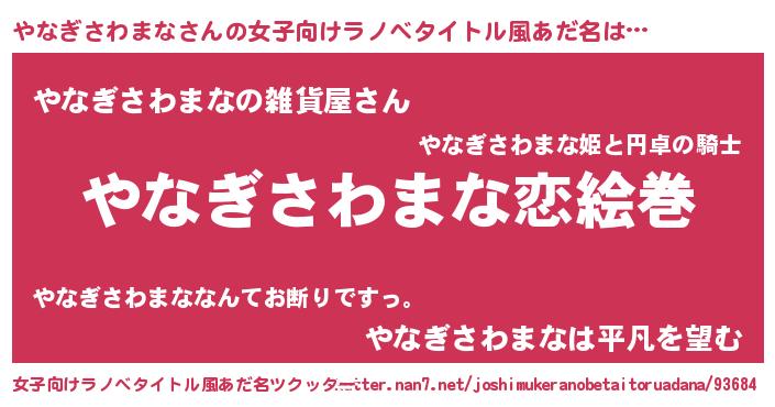 | 男性向けラノベタイトル風あだ名 | 『おまえをオタクにしてやるから、俺をやなぎさわまなにしてくれ! 』 |