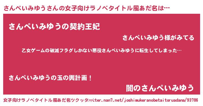 | 男性向けラノベタイトル風あだ名 | 『魔弾の王とさんぺいみゆう』 |
