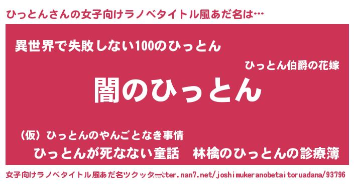 | 男性向けラノベタイトル風あだ名 | 『Re:ひっとんから始める異世界生活』 |