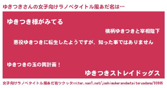 | 男性向けラノベタイトル風あだ名 | 『この素晴らしい世界にゆきつきを!』 |