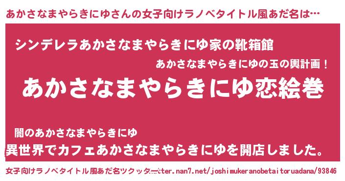 | 男性向けラノベタイトル風あだ名 | 『おまえをオタクにしてやるから、俺をあかさなまやらきにゆにしてくれ! 』 |
