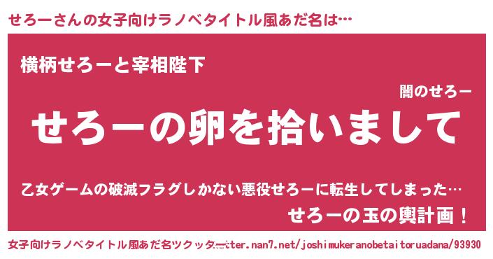 せろーさんの女子向けラノベタイトル風あだ名は… 『せろーの卵を拾いまして』『横柄せろーと宰相陛下』『せろーの玉の輿計画!』 ツクッター #女子向けラノベタイトル風あだ名ツクッター http://tkutter.nan7.net/joshimukeranobetaitoruadana/93930/