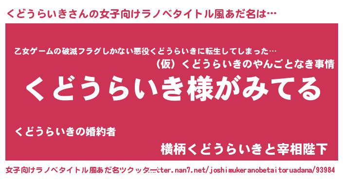 | 男性向けラノベタイトル風あだ名 | 『くどうらいきの嫁は女の子じゃないと思った?』 |