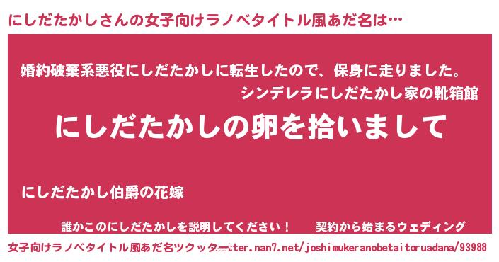 | 男性向けラノベタイトル風あだ名 | 『ダンジョンににしだたかしを求めるのは間違っているだろうか』 |