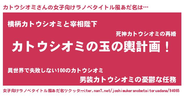| 男性向けラノベタイトル風あだ名 | 『カトウシオミ~年齢イコール彼女いない歴の魔法使い~』 |