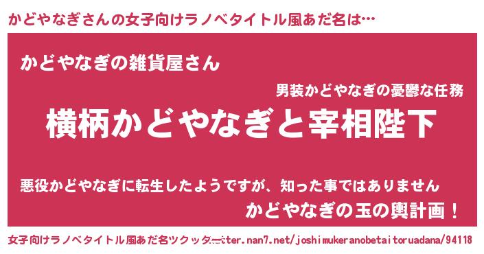 | 男性向けラノベタイトル風あだ名 | 『かどやなぎに滅ぼされるだけの簡単なお仕事です』 |