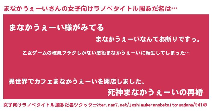 | 男性向けラノベタイトル風あだ名 | 『この素晴らしい世界にまなかうぇーいを!』 |