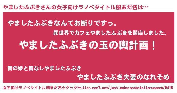 | 男性向けラノベタイトル風あだ名 | 『やましたふぶき~年齢イコール彼女いない歴の魔法使い~』 |