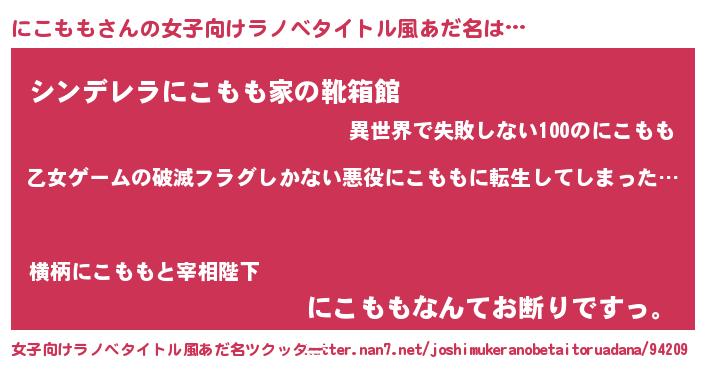 | 男性向けラノベタイトル風あだ名 | 『この素晴らしい世界ににこももを!』 |