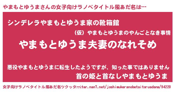 | 男性向けラノベタイトル風あだ名 | 『おまえをオタクにしてやるから、俺をやまもとゆうまにしてくれ! 』 |